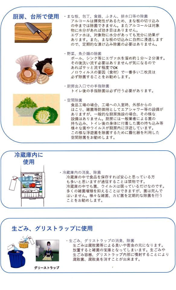 日本国内においてもカズノコ やオレンジの消毒および保存用の食品添加物として、また、病院や公衆浴場の殺菌剤としても広く使用されています。