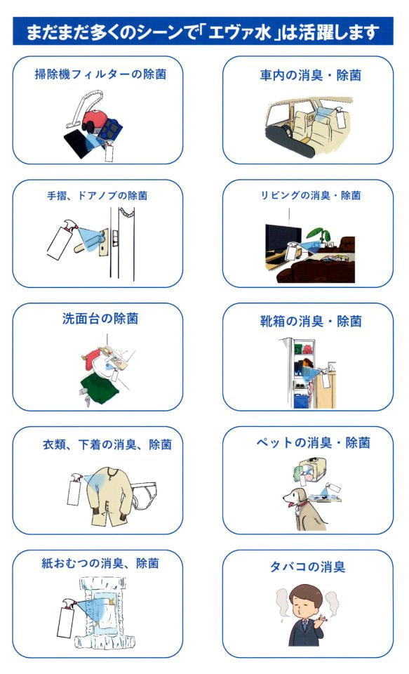 例えば、空間の除菌・脱臭・ウィルス駆除を目的とした空気清浄機や手洗い後の消毒液、お風呂場のカビを防止する清掃液として用いられるなど多岐に渡ります。