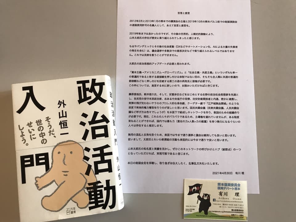 2012年2月と2013年1月の熊本での講演会の主催と2019年10月の熊本パルコ前での街頭演説会の道路使用許可の名義人として、あえて苦言と提言を。
