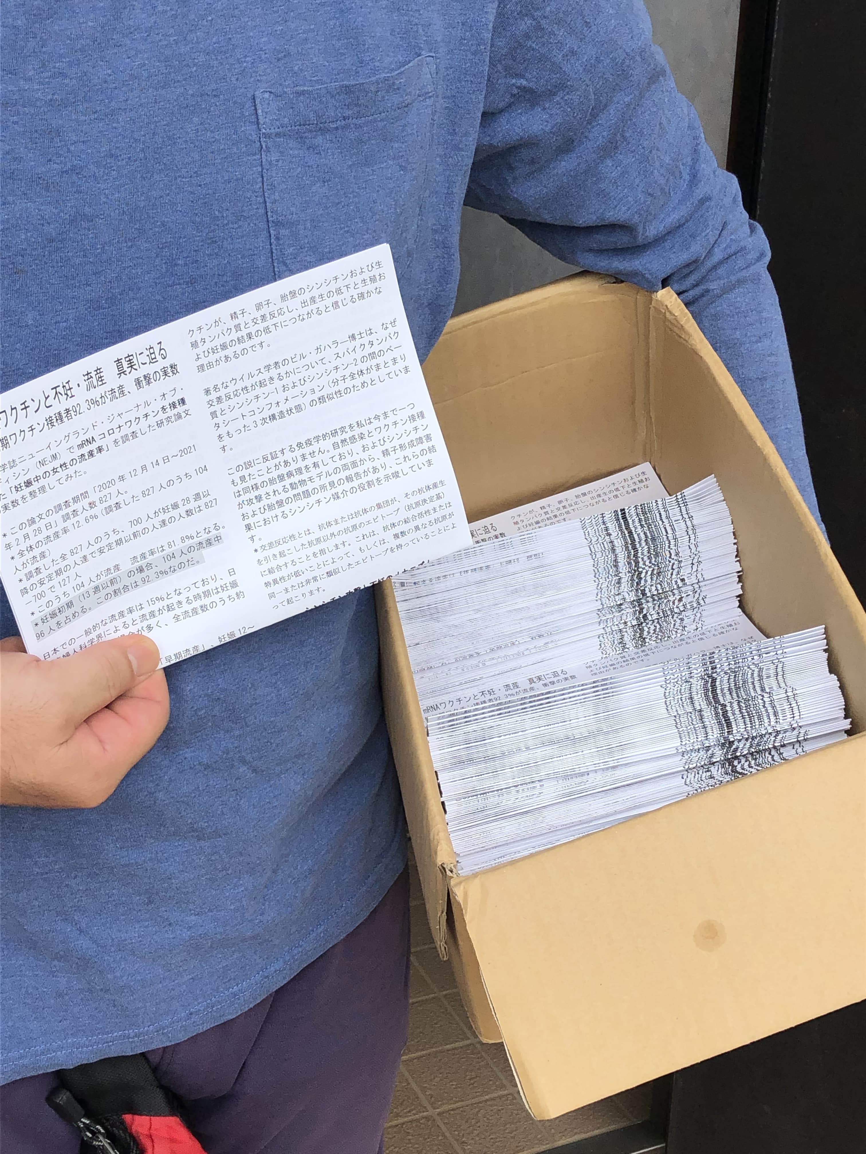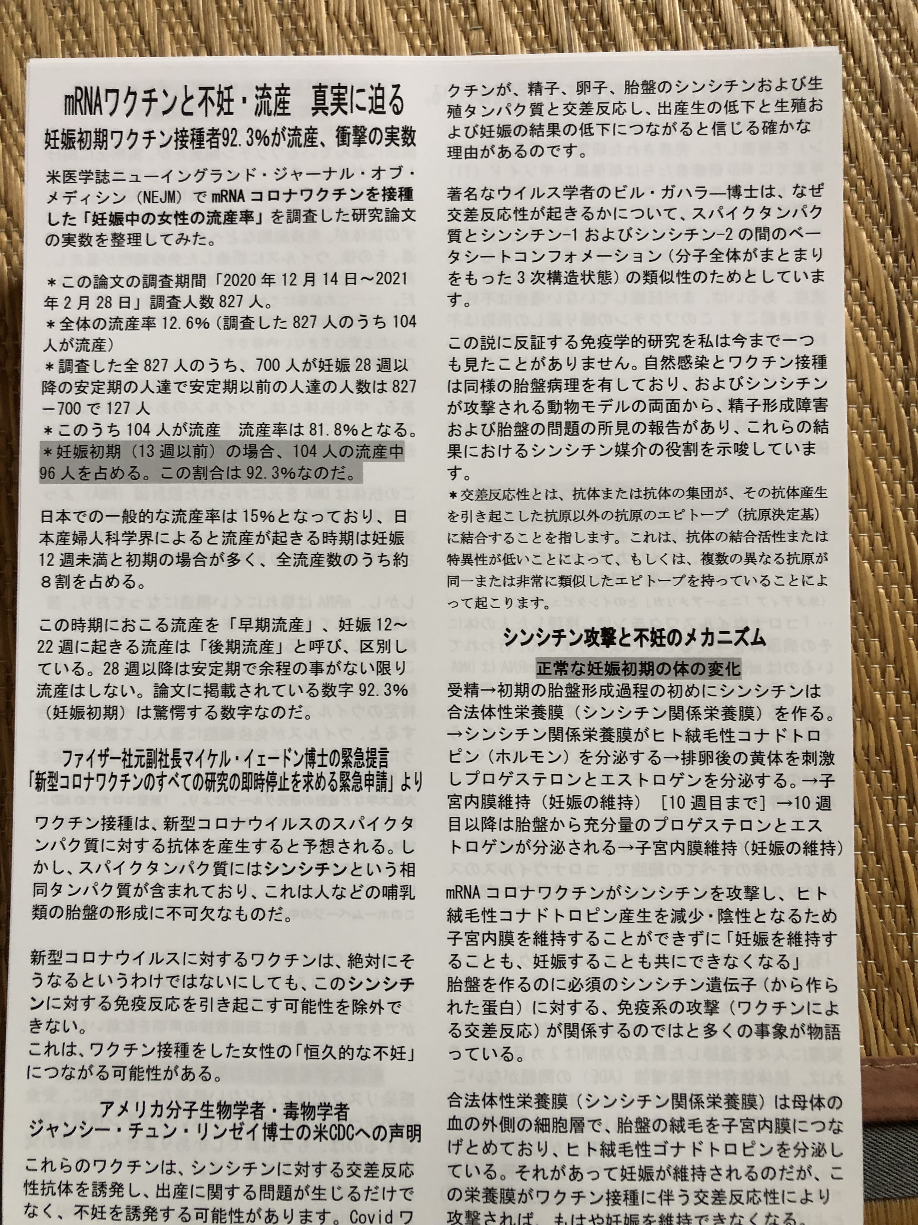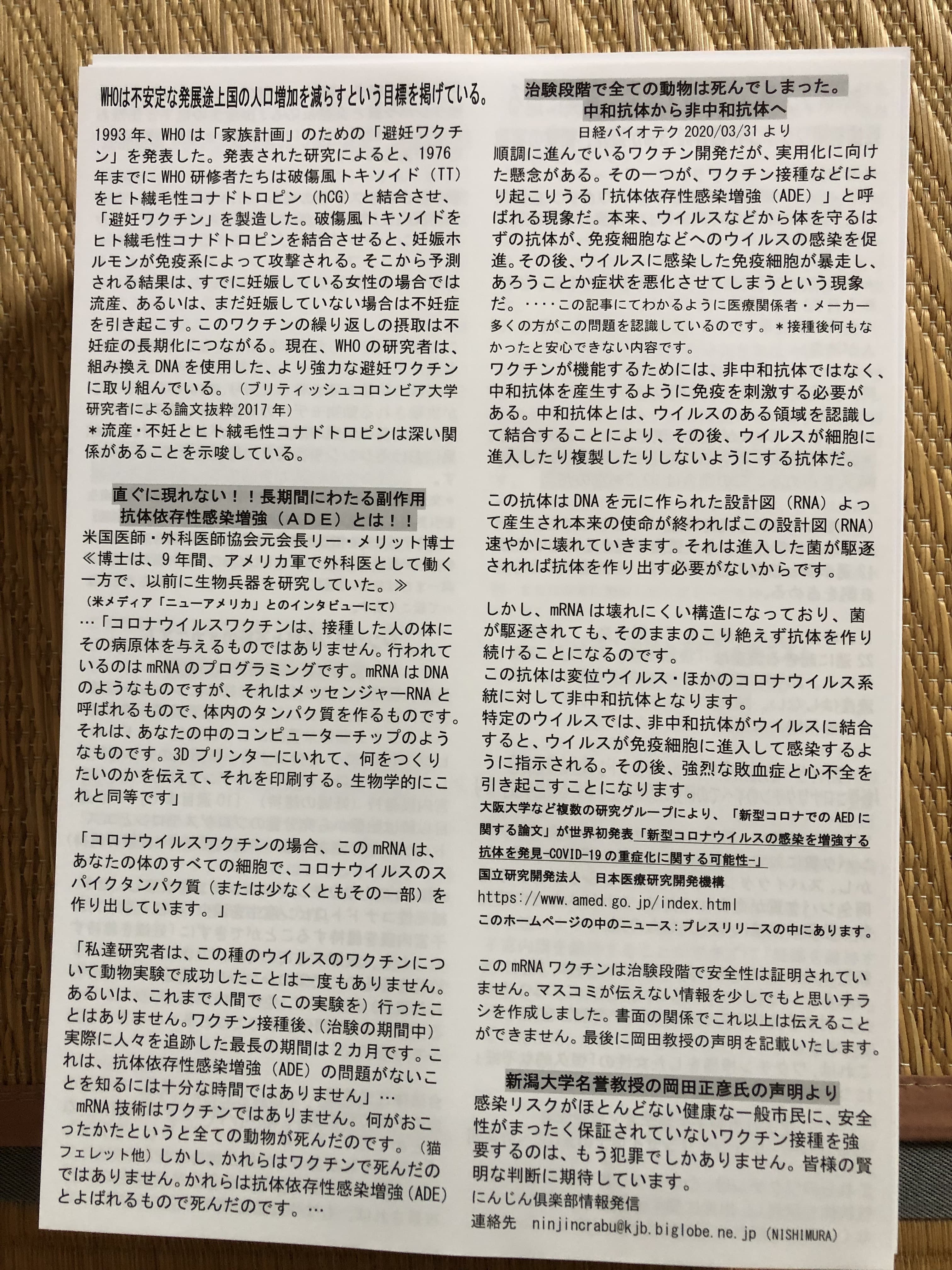この mRNA ワクチンは治験段階で安全性は証明されていません。マスコミが伝えない情報を少しでもと思いチラ シを作成しました。書面の関係でこれ以上は伝えることができません。最後に岡田教授の声明を記載いたします。